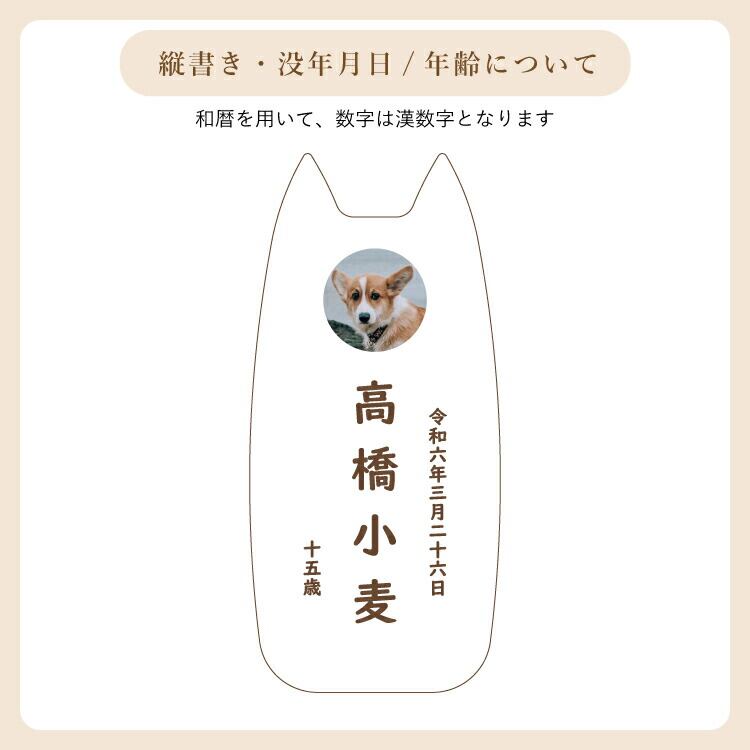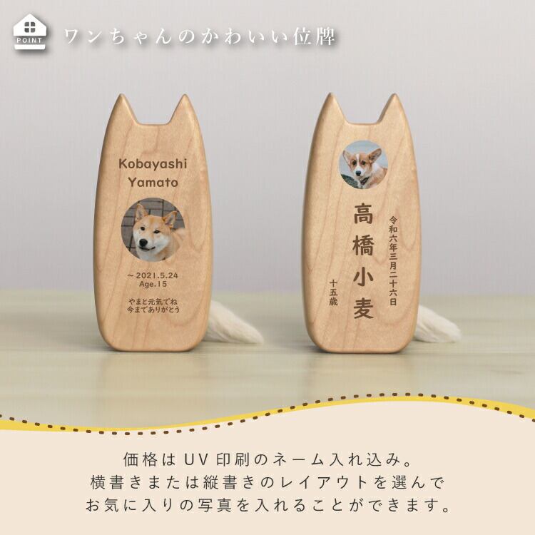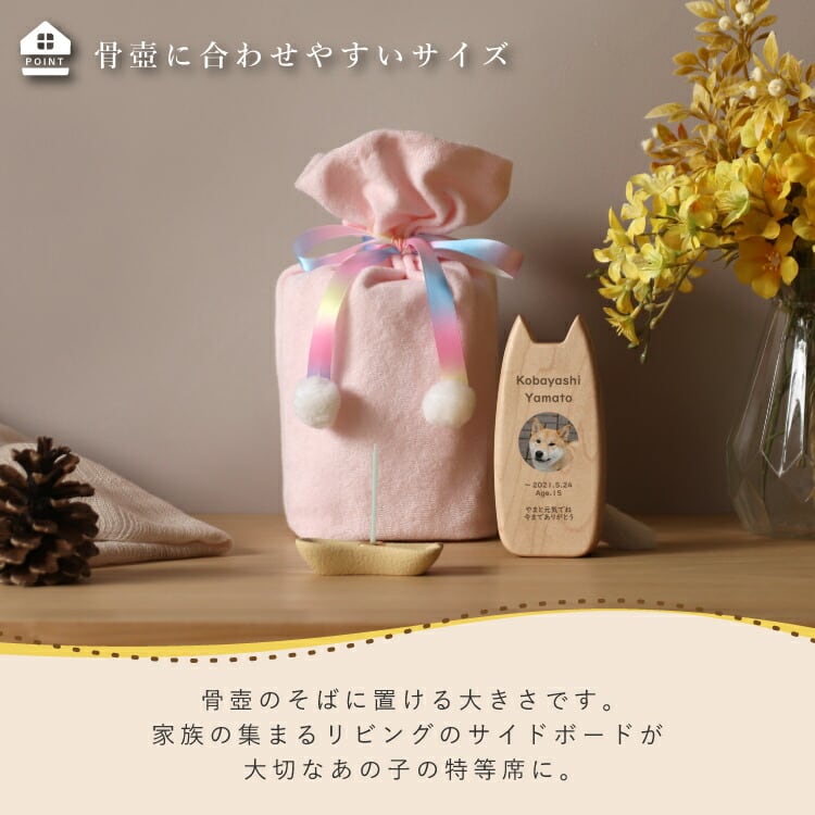 かわいい犬型のペット位牌です。小さいので仏壇や骨壺、メモリアルグッズのそばに置きやすく、大切なワンちゃんを本格的にペット供養できます。名入れ代込み。