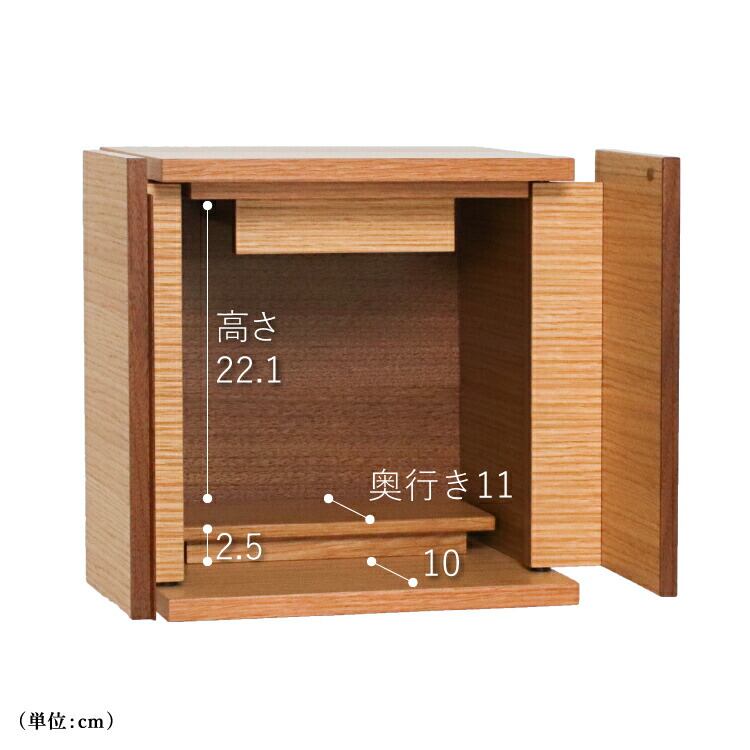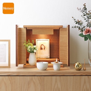 必要最小限で構成したシンプルなミニ仏壇。リビングに置きやすいコンパクトなサイズで、木目を横方向にデザインし、おしゃれな雰囲気を演出しました。