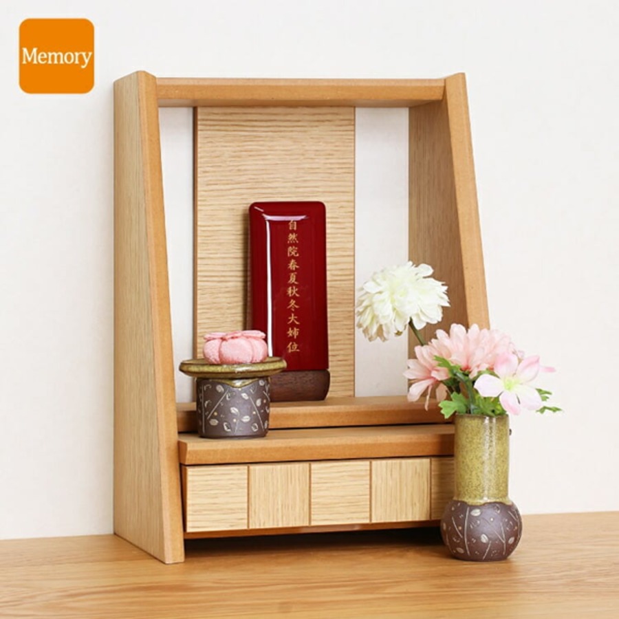 扉と背板のない開放的でおしゃれなミニ仏壇。マンションに置ける小さいサイズでリビングのインテリアと馴染みます。シンプルな手元供養にも人気です。