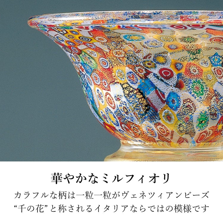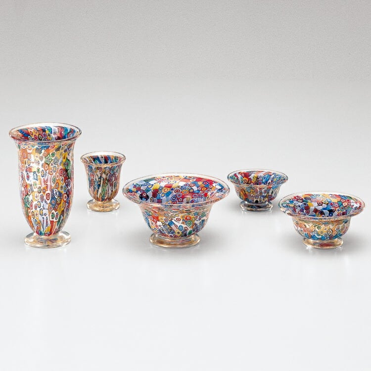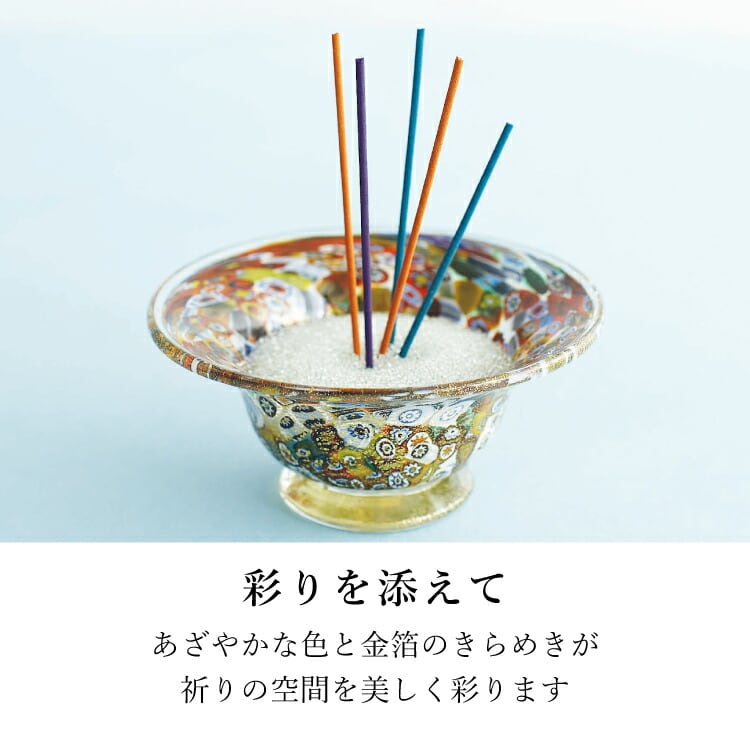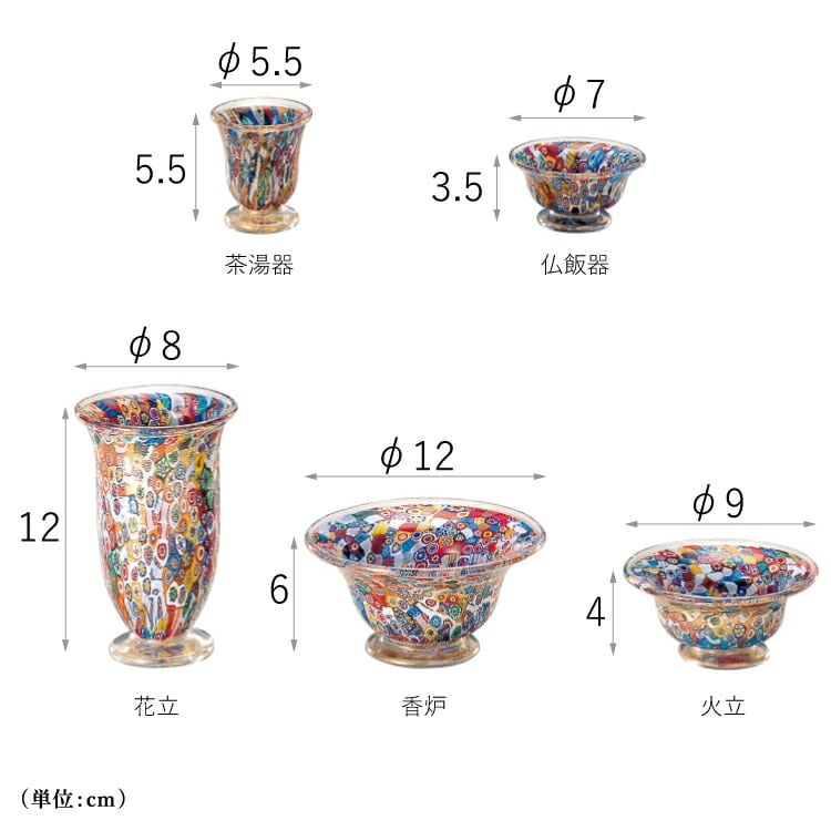おしゃれなモダン仏具です。イタリアの職人がハンドメイドで制作したヴェネチアンガラス製の5点仏具セット。モダン仏壇を繊細なミルフィオリが華やかに彩ります。