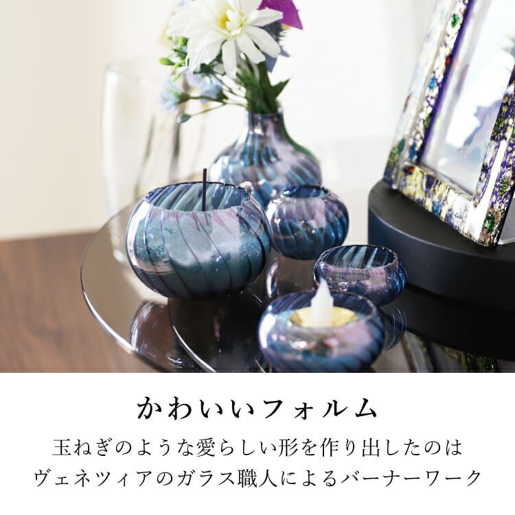 おしゃれなモダン仏具です。イタリアの職人がハンドメイドで制作した5点仏具セット。耐熱ガラスなので温かいお茶を直接入れられます。丸くてかわいい形が人気。