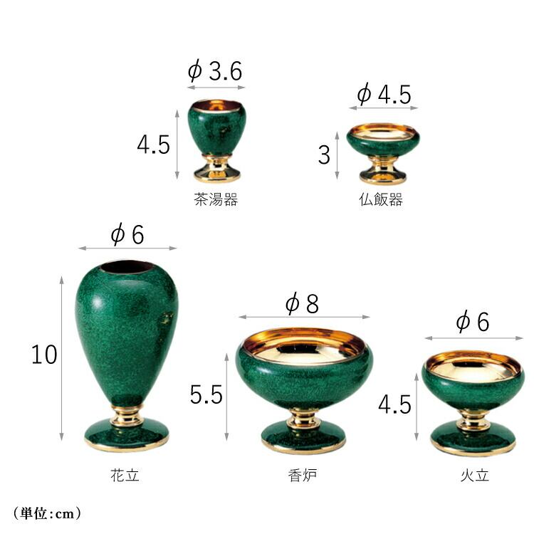 ■サイズ:花立:直径6cm 高さ10cm香炉:直径8cm 高さ5.5cm火立:直径6cm 高さ4.5cm茶湯器:直径3.6cm 高さ4.5cm仏飯器:直径4.5cm 高さ3cm