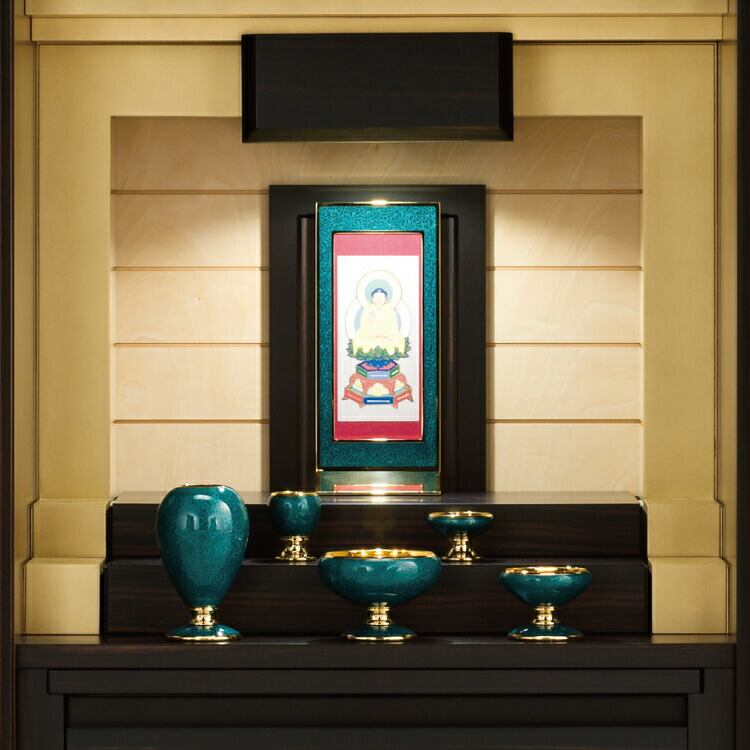 おしゃれなモダン仏具です。漆塗と七宝焼を組み入れた独自技法による日本製の5点仏具セット。格調高い佇まいでモダン仏壇をワンランク上の空間に演出します。