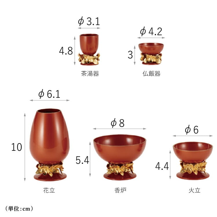 ■サイズ:花立:直径6.1cm 高さ10cm香炉:直径8cm 高さ5.4cm火立:直径6cm 高さ4.4cm茶湯器:直径3.1cm 高さ4.8cm仏飯器:直径4.2cm 高さ3cm