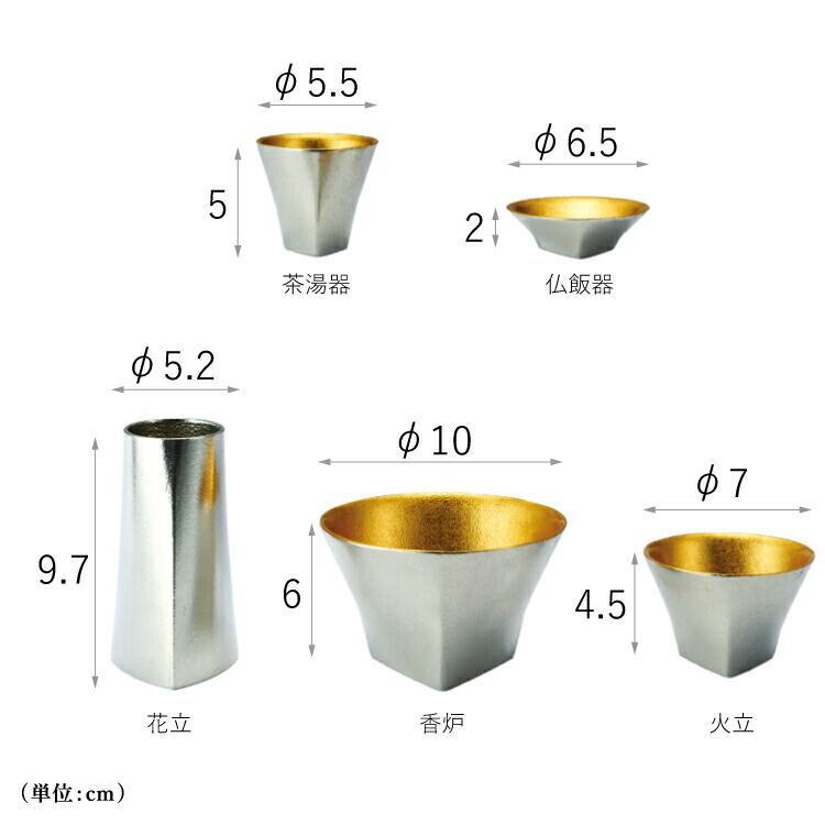 ■サイズ:花立:直径5.2cm 高さ9.7cm香炉:直径10cm 高さ6cm火立:直径7cm 高さ4.5cm茶湯器:直径5.5cm 高さ5cm仏飯器:直径6.5cm 高さ2cm