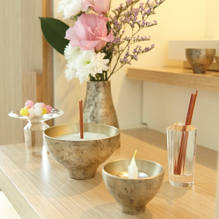 おしゃれなモダン仏具です。伝統工芸「高岡銅器」の日本製5点仏具セット。趣のある色はモダン仏壇になじみやすく、時とともに自然と風合いが増していきます。