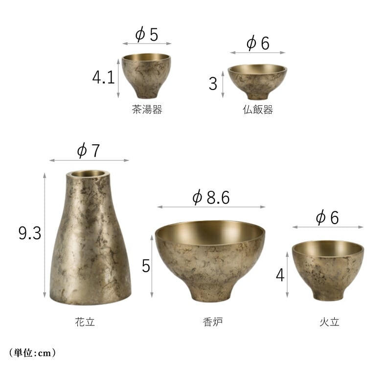 ■サイズ:花立:直径7cm 高さ9.3cm香炉:直径8.6cm 高さ5cm火立:直径6cm 高さ4cm茶湯器:直径5cm 高さ4.1cm仏飯器:直径6cm 高さ3cm