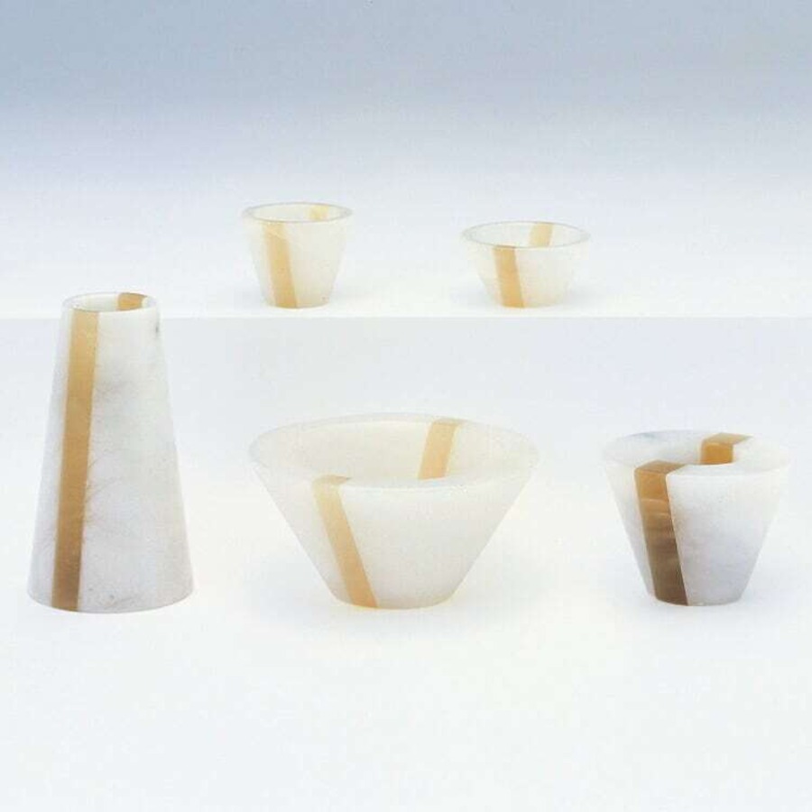 おしゃれなモダン仏具です。天然石アラバスターを削り出したイタリア製5点仏具セット。滑らかで透光性のある白色と石目模様は一つとして同じものはありません。