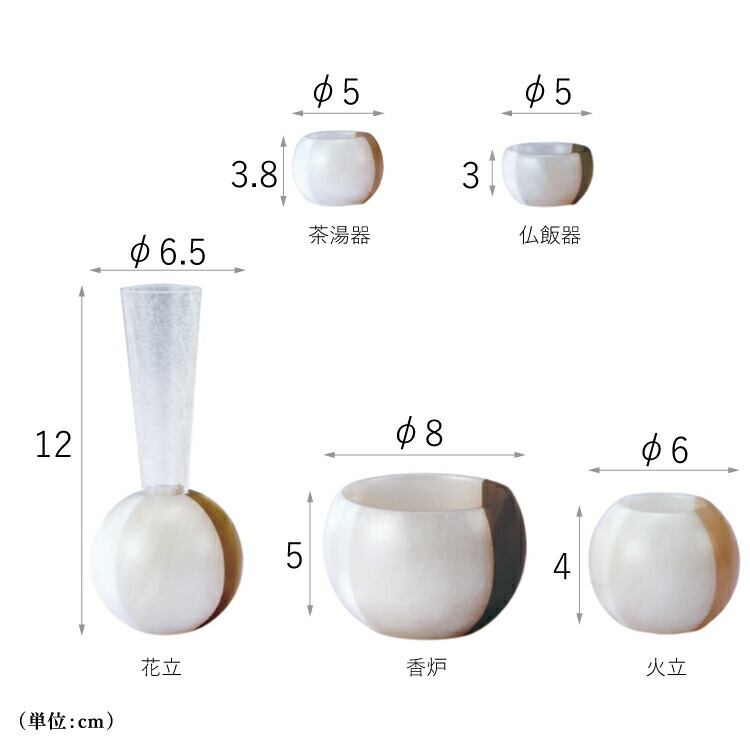 ■サイズ:花立:直径6.5cm 高さ12cm香炉:直径8cm 高さ5cm火立:直径6cm 高さ4cm茶湯器:直径5cm 高さ3.8cm仏飯器:直径5cm 高さ3cm