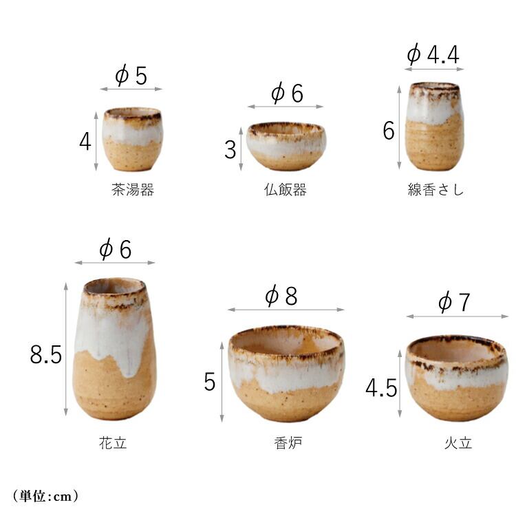 ■サイズ:花立:直径6cm 高さ8.5cm香炉:直径8cm 高さ5cm火立:直径7cm 高さ4.5cm茶湯器:直径5cm 高さ4cm仏飯器:直径6cm 高さ3cm線香差し:直径4.4cm 高さ6cm