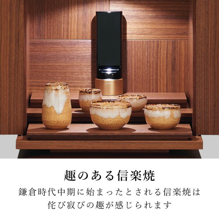 おしゃれなモダン仏具です。伝統工芸「信楽焼」の日本製6点仏具セット。日本六古窯の一つで、土のあたたかな風合いと豊かな表情がモダン仏壇にマッチします。