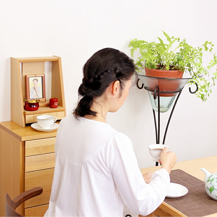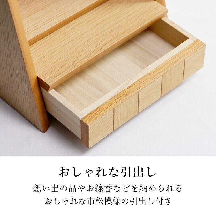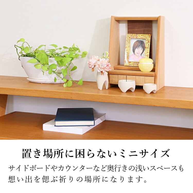 扉のないおしゃれなミニ仏壇。マンションに置ける小さいサイズで、リビングやインテリアに合わせて背板を変えられます。シンプルな手元供養にも人気です。