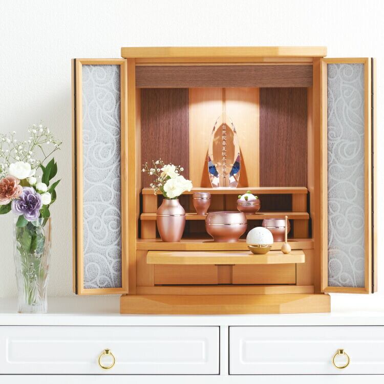 おしゃれなモダン仏具です。伝統工芸「高岡銅器」の日本製5点仏具セット。ふたつの異なる光沢と銀色の輝きがモダン仏壇に映えてワンランク上の空間を演出します。