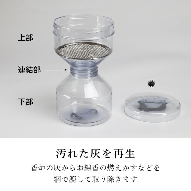 灰のお手入れ用品。香炉の灰をふるいにかけて燃えかすを取り除いてきれいにします。かたまった灰も再生。お盆、お彼岸、お正月、法事、法要のお掃除用品。