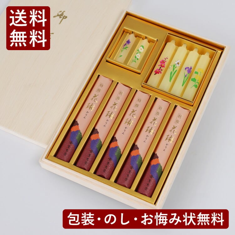 白檀の甘く優雅な香りが広がるお線香。高級な蜜蝋入ローソクとのセットで法事のご進物や贈答用、喪中見舞いにおすすめです。包装・表書き・お悔み状無料。