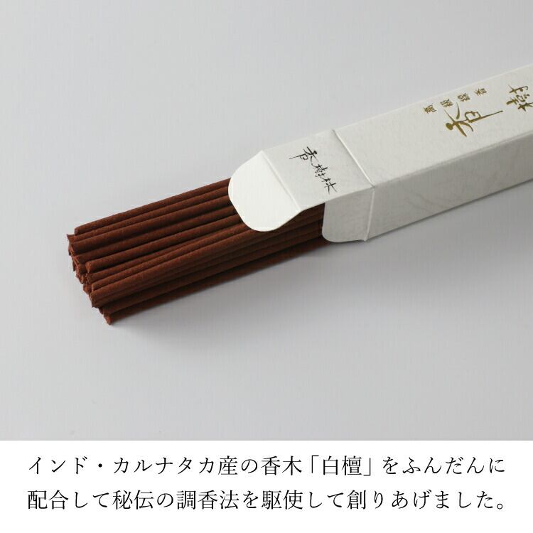 インド・カルナタカ産の香木「白檀」をふんだんに配合して秘伝の調香法で創り上げた甘く爽やかな香りが特徴のお線香です。ご進物や喪中見舞いの贈り物におすすめ。