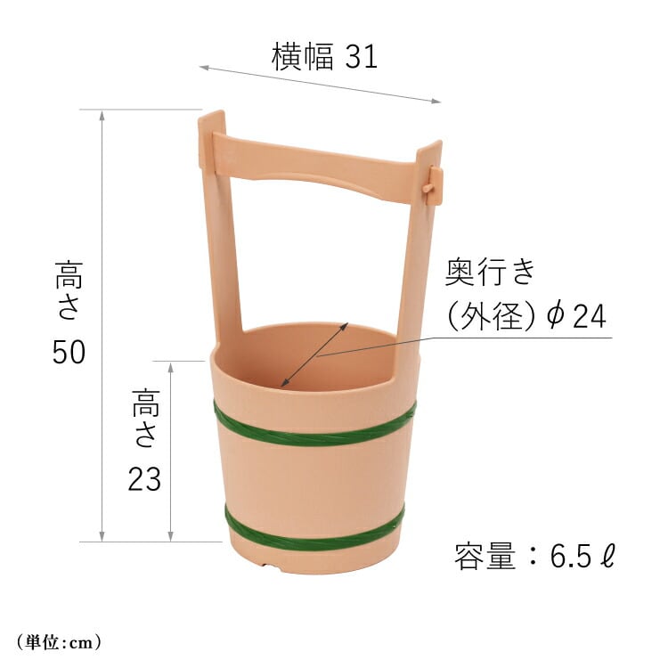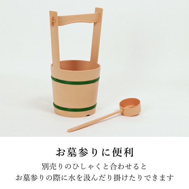 プラスチック製の丈夫な手桶。強度が高く、熱に強いポリプロピレンなので、屋外で長く使えます。軽量で持ち運びやすく、お墓参りや水やりに便利です。