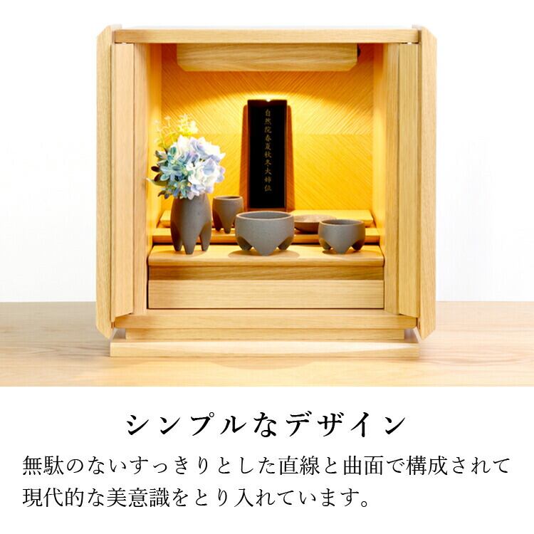 おしゃれなモダン位牌です。すっきりとしたシンプルで直線的なデザイン。コンパクトで夫婦位牌の名入れもできるので小さい仏壇や手元供養にもおすすめです。