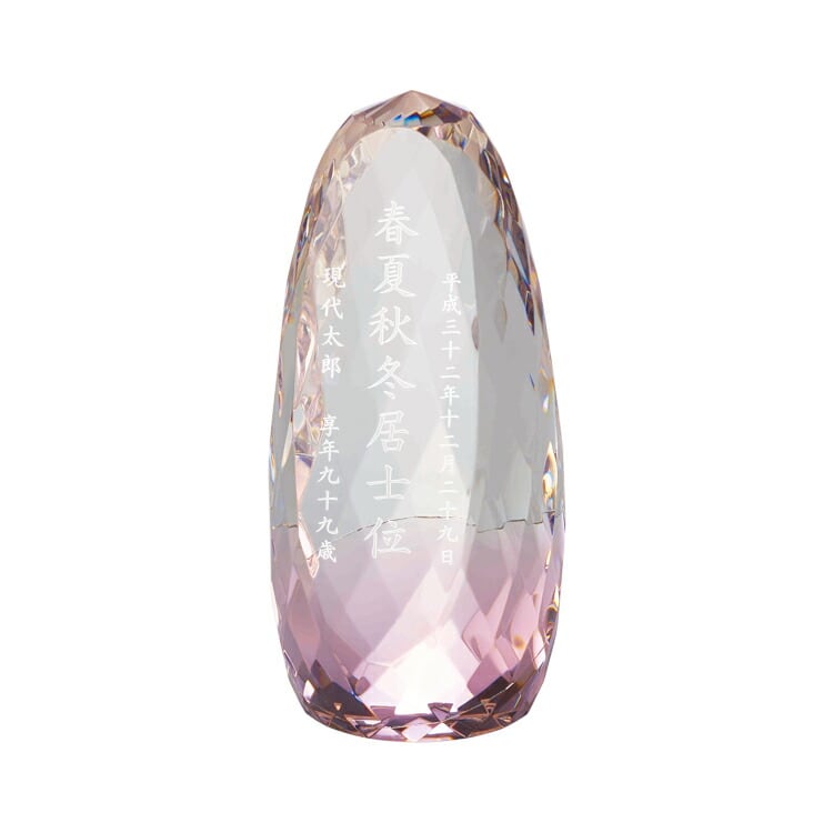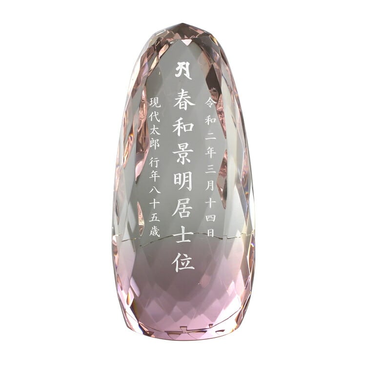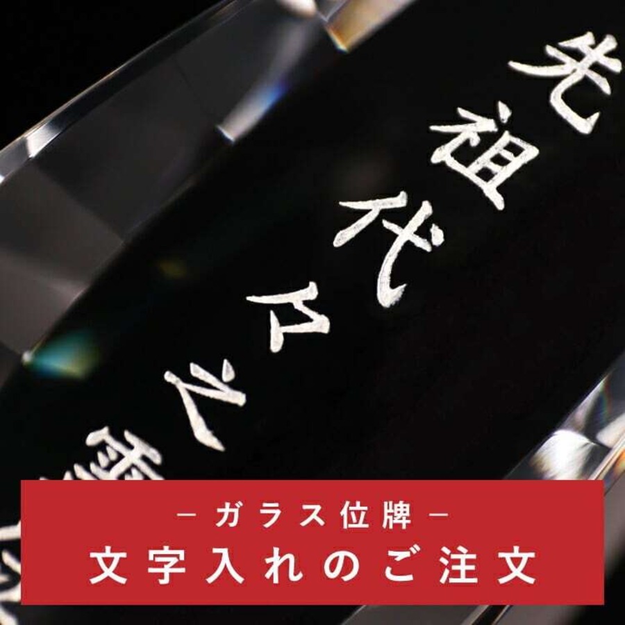 おしゃれなガラス位牌です。光の反射と屈折の美しさを最大限に引き出したモダンデザイン。戒名のない無宗教の手元供養にもおすすめです。文字入れ代別途。