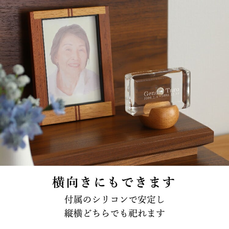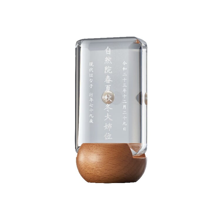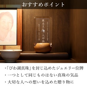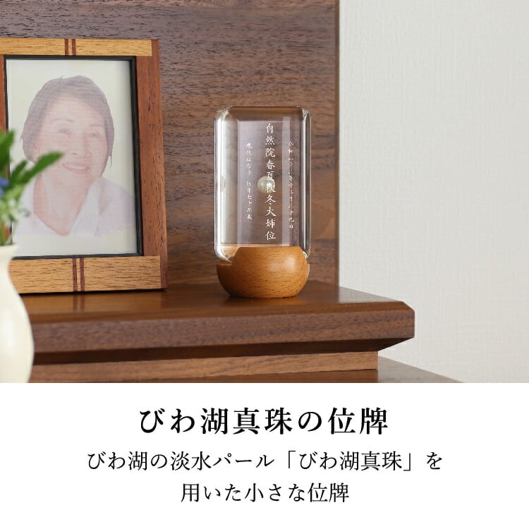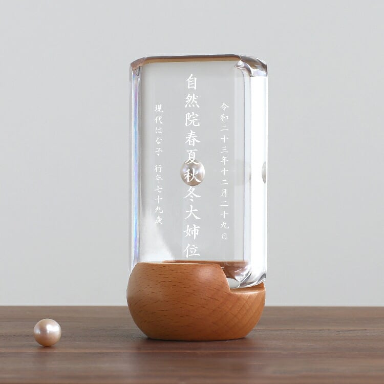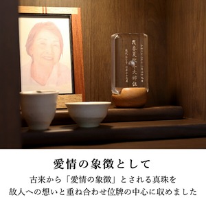 おしゃれな真珠入りモダン位牌です。小さいのでミニ仏壇に合わせやすく、横書きのメッセージを記して手元供養にもできます。お一人様の名入れを別途承ります。