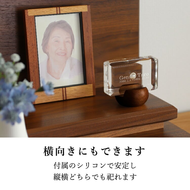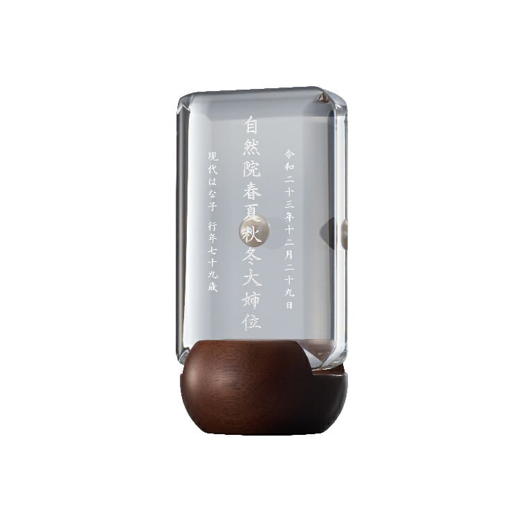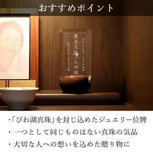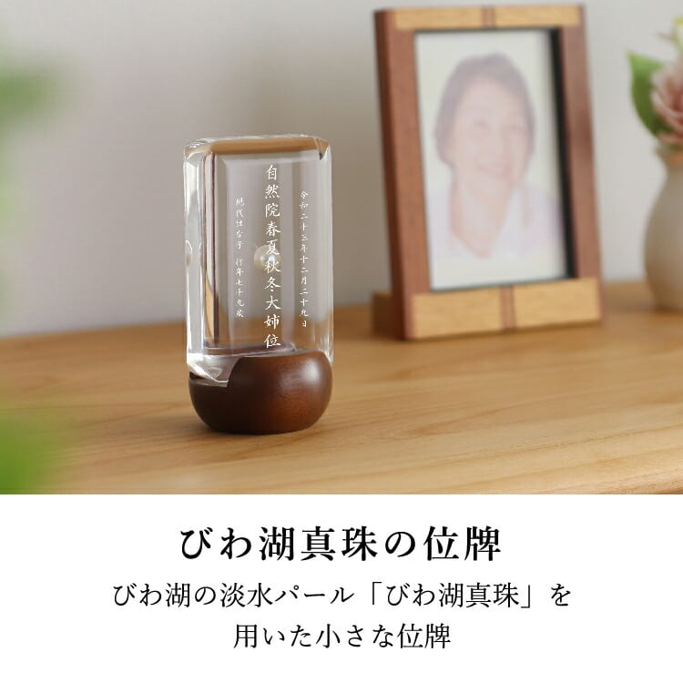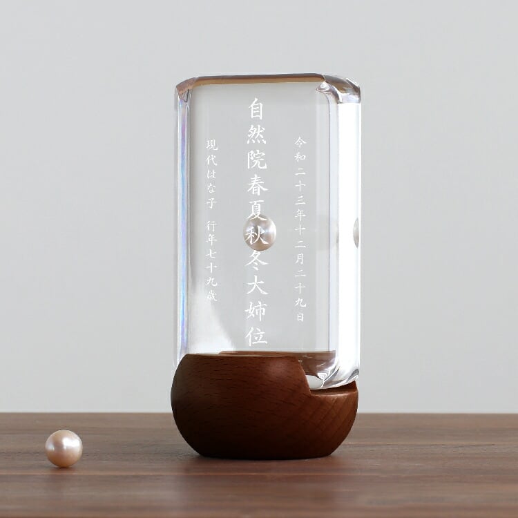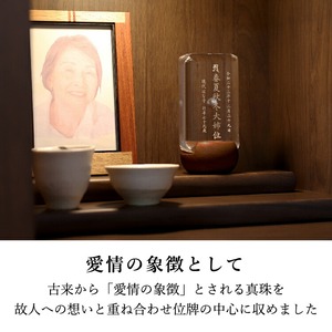 おしゃれな真珠入りモダン位牌です。小さいのでミニ仏壇に合わせやすく、横書きのメッセージを記して手元供養にもできます。お一人様の名入れを別途承ります。