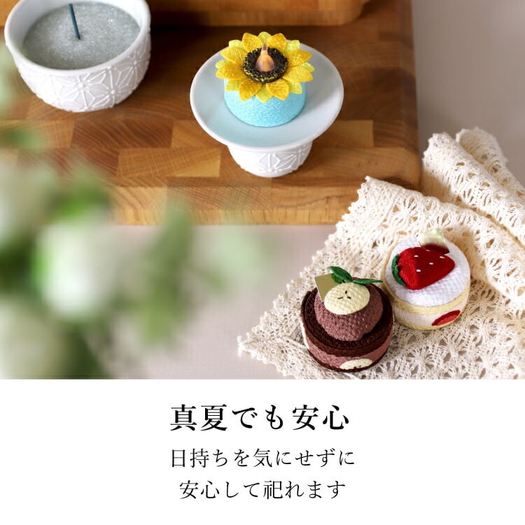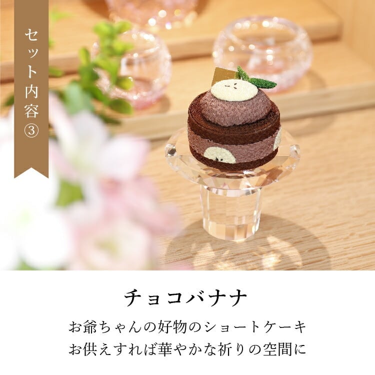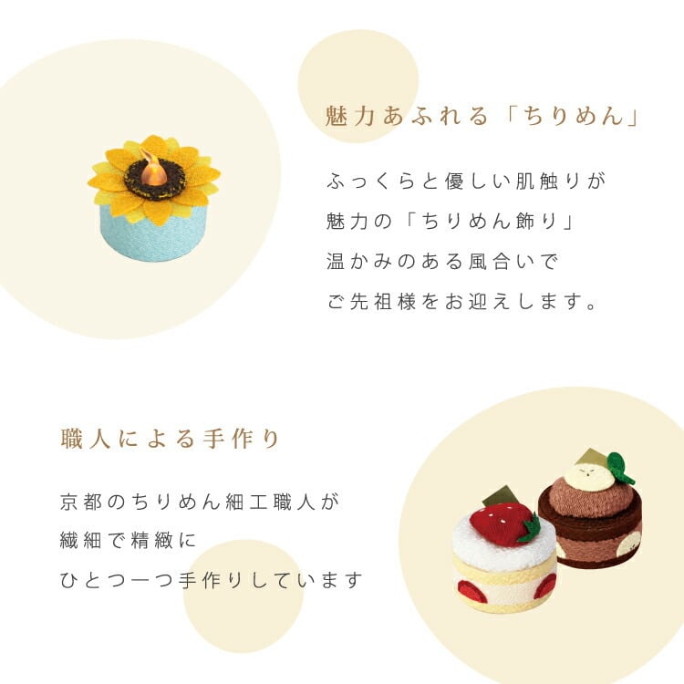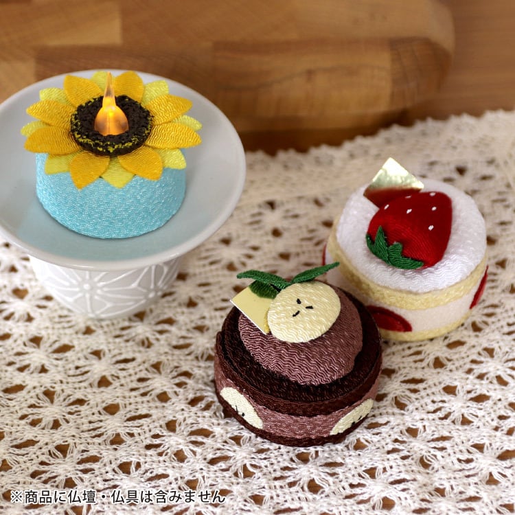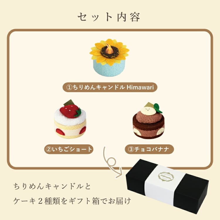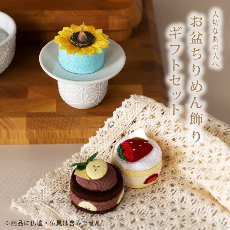 商品説明:人気のちりめん飾り(いちごショート、チョコバナナ、ちりめんキャンドルひまわり)を詰め合せたギフトボックス。お盆や法事のお供えとして贈り物におすすめです。