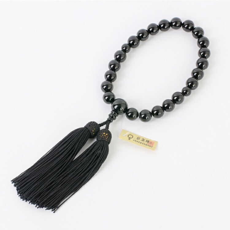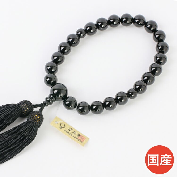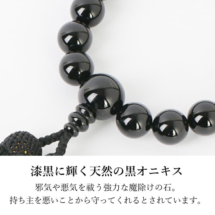 全ての宗派でお使いいただける男性用略式数珠です。京都の職人が丁寧に制作した「京念珠」なので丈夫で美しい仕上がり。漆黒に輝く黒オニキスを使用しました。
