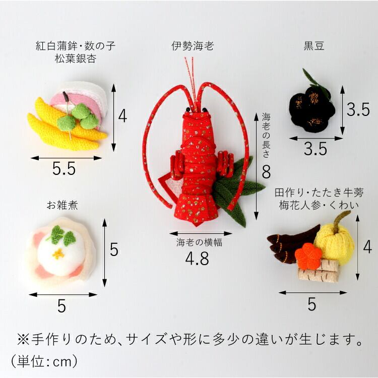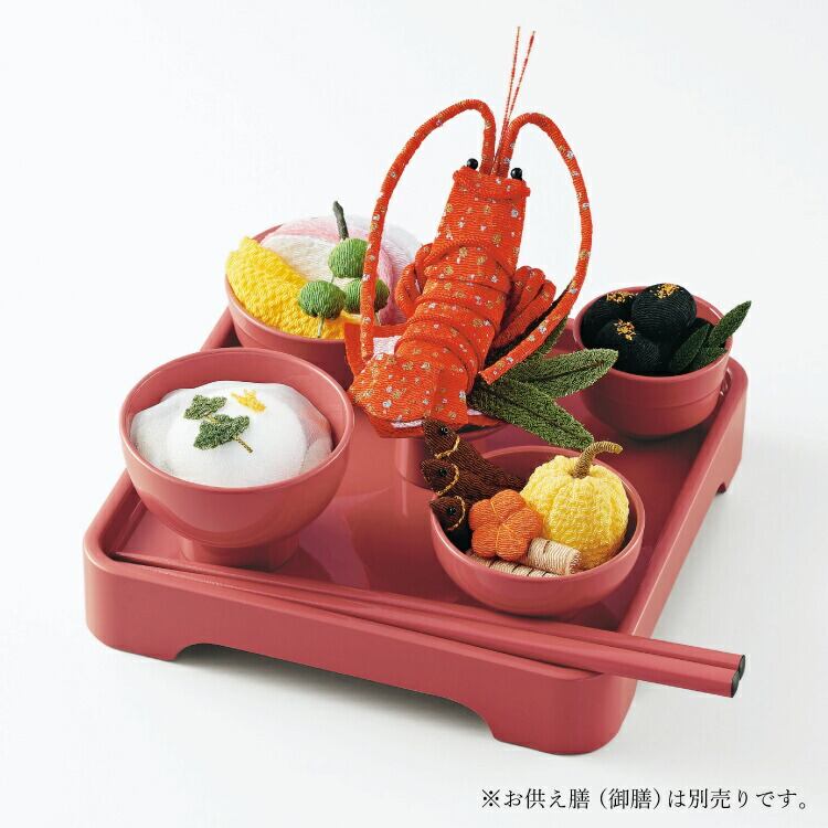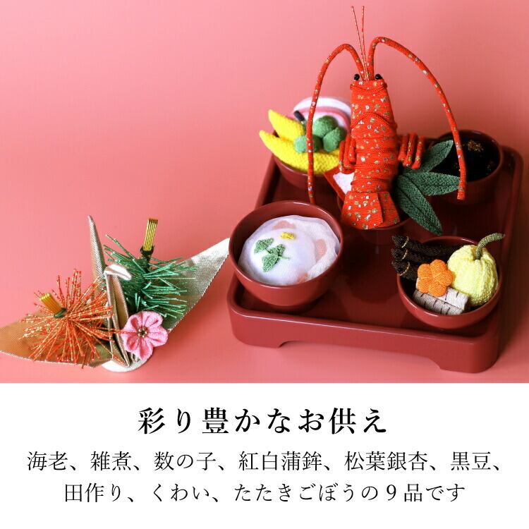 ちりめん細工のおせち料理。ミニサイズの伊勢海老やかわいい梅花人参など、一年の幸福を祈る正月飾りです。イミテーションだから傷む心配がなく毎年飾れます。