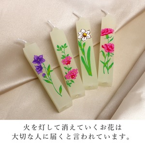 蜜蝋入りの絵ローソクです。油煙が少なく、最後まできれいに燃えます。蓮・あやめ・水仙・桜・桔梗・梅・菊・カーネーション・萩がおしゃれ。贈り物に最適です。