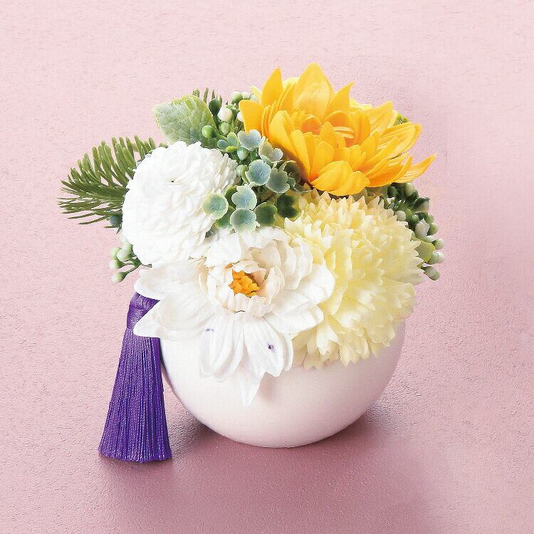 枯れない仏花です。ソープフラワーは石鹸の素材で作った造花なので水替えの手間がなく、ほのかに優しく香ります。お盆のお供えやお悔みの贈り物におすすめです。