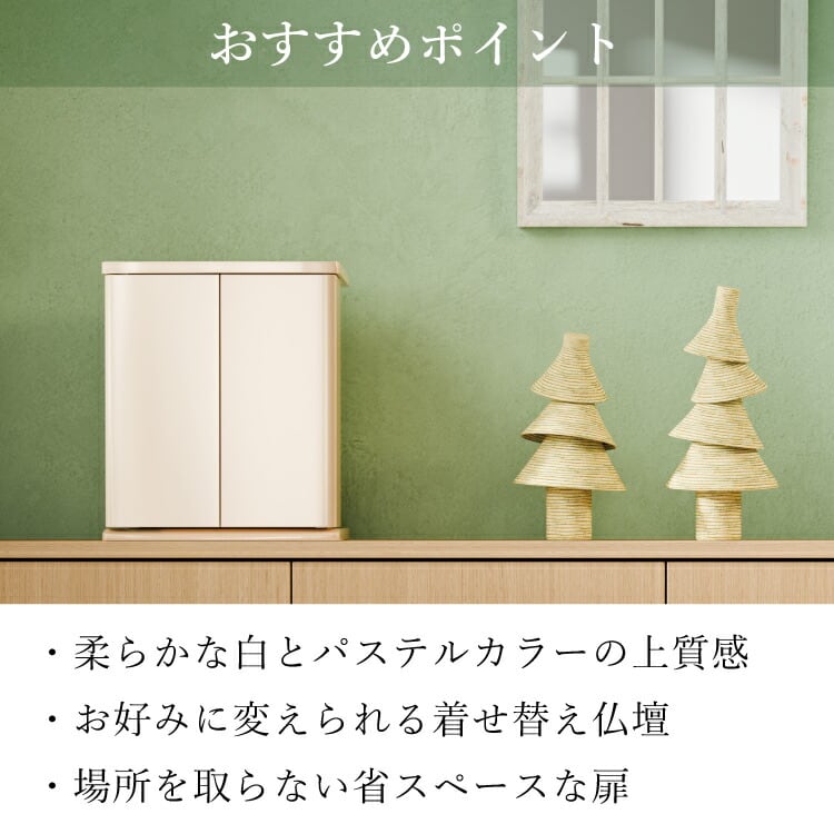 おしゃれな白色のモダン仏壇です。コンパクトに折り畳める扉や色を変えられる背板などリビングやマンションに置きやすく、日本製ならではの丁寧な仕上がりです。