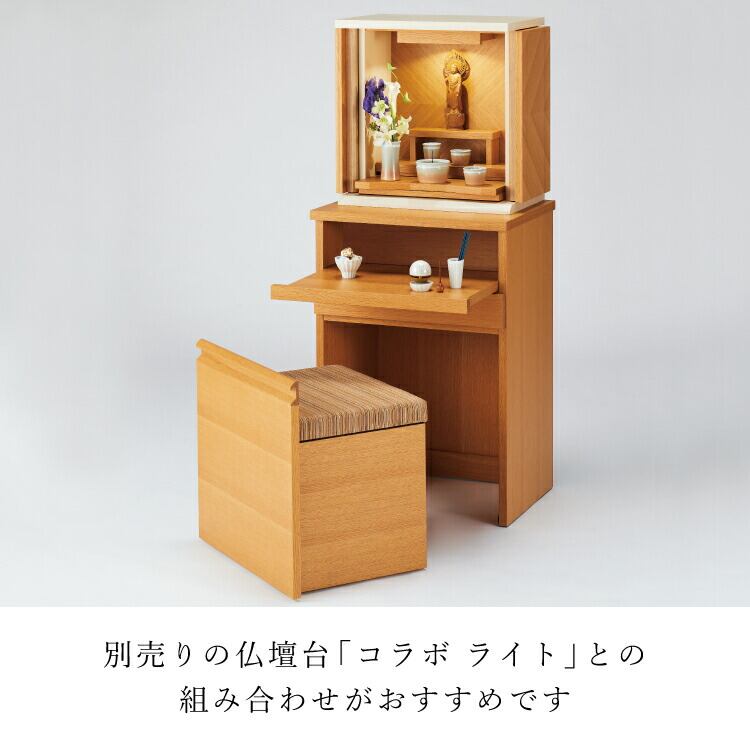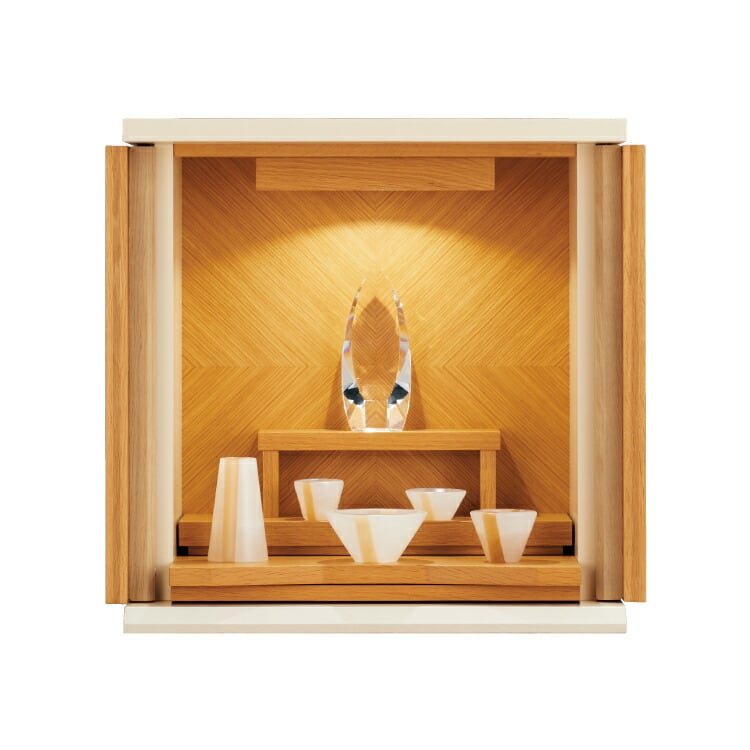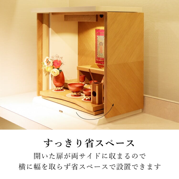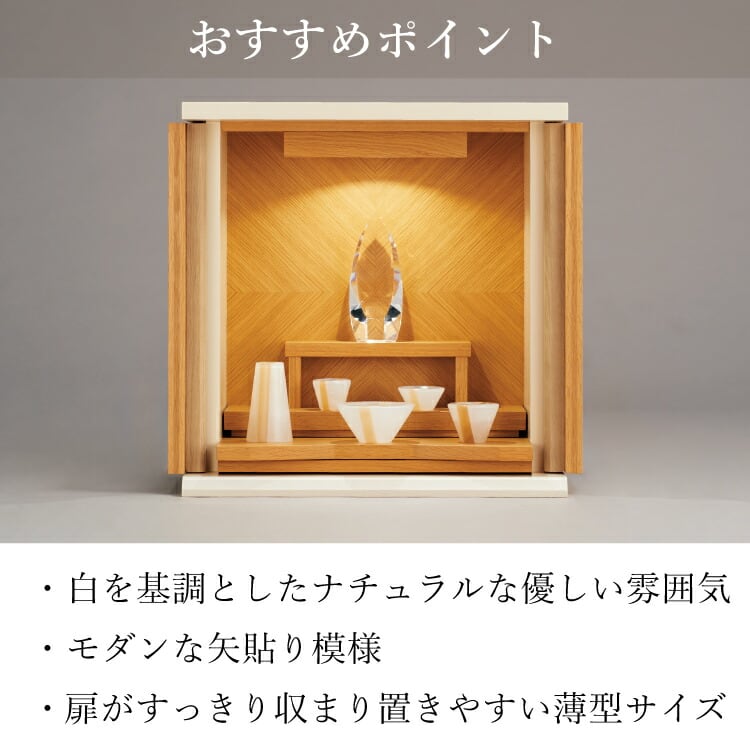 矢貼り模様がおしゃれなモダン仏壇です。扉がコンパクトに折り畳めて両側に収まるのでリビングやマンションに置きやすく、日本製ならではの丁寧な仕上がりです。