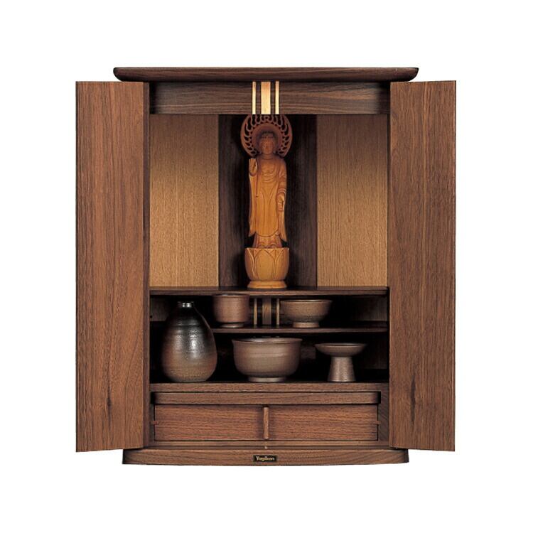 おしゃれなモダン仏壇です。リビングやマンションに置きやすいミニ仏壇。小さいながら日本製ならではの精緻な木製の丁番や象嵌細工に木のぬくもりが感じられます。