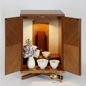 矢貼り模様がおしゃれなモダン仏壇です。リビングやマンションに置きやすいミニ仏壇。小さいながら日本製ならではきめ細やかな作りで、手元供養にもおすすめです。