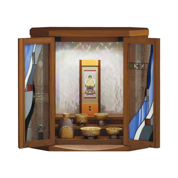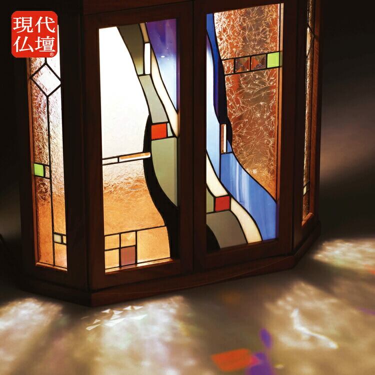 おしゃれなステンドグラスのモダン仏壇。コンパクトな上置き仏壇だからリビングやマンションに置きやすく、日本製ならではの色彩で幻想的な雰囲気を醸し出します。