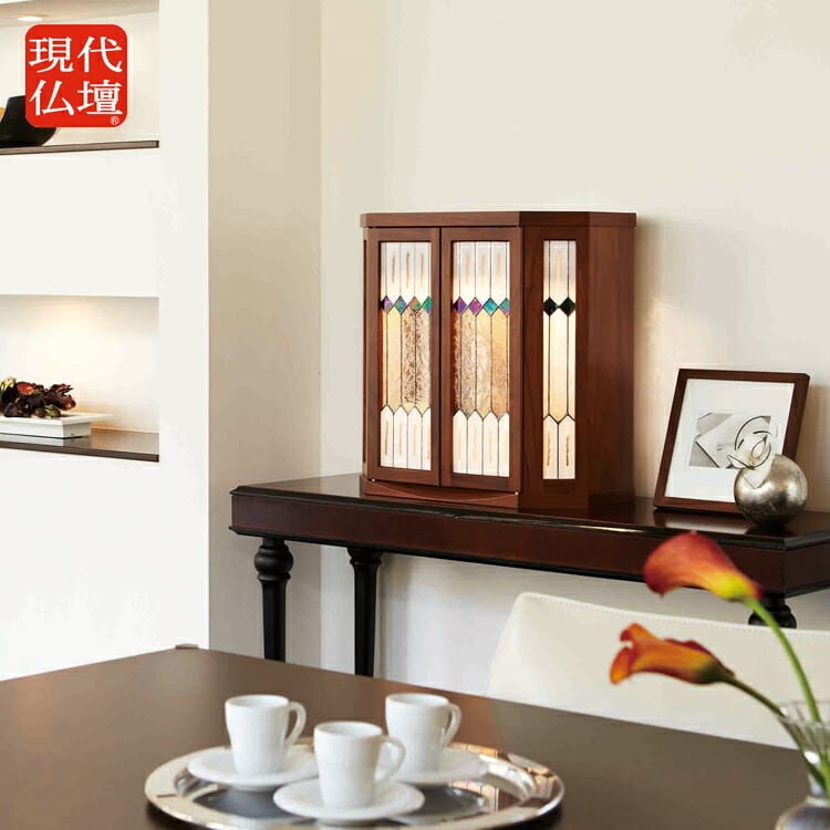 おしゃれなステンドグラスのモダン仏壇。コンパクトな上置き仏壇だからリビングやマンションに置きやすく、日本製ならではの色彩で幻想的な雰囲気を醸し出します。