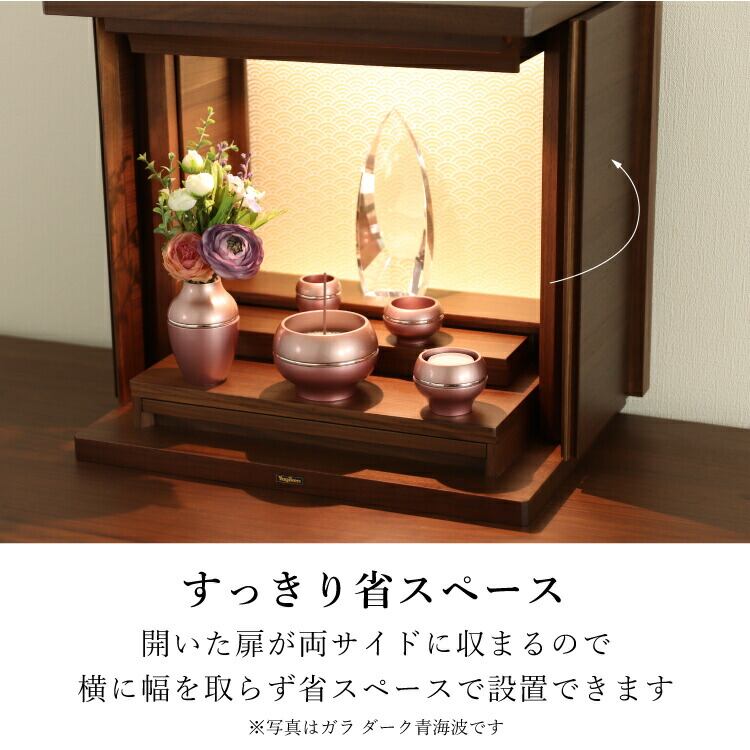 おしゃれなモダン仏壇です。扉が両側に収まるコンパクトな上置き仏壇なのでリビングやマンションに置きやすく、日本製ならではの和柄にぬくもりが感じられます。