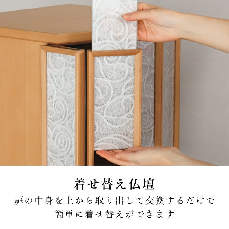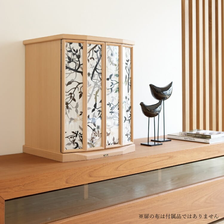 おしゃれなモダン仏壇です。コンパクトな上置き仏壇なのでリビングやマンションに置きやすく、安心の日本製。インテリアに合わせて扉の中身を入れ替えられます。