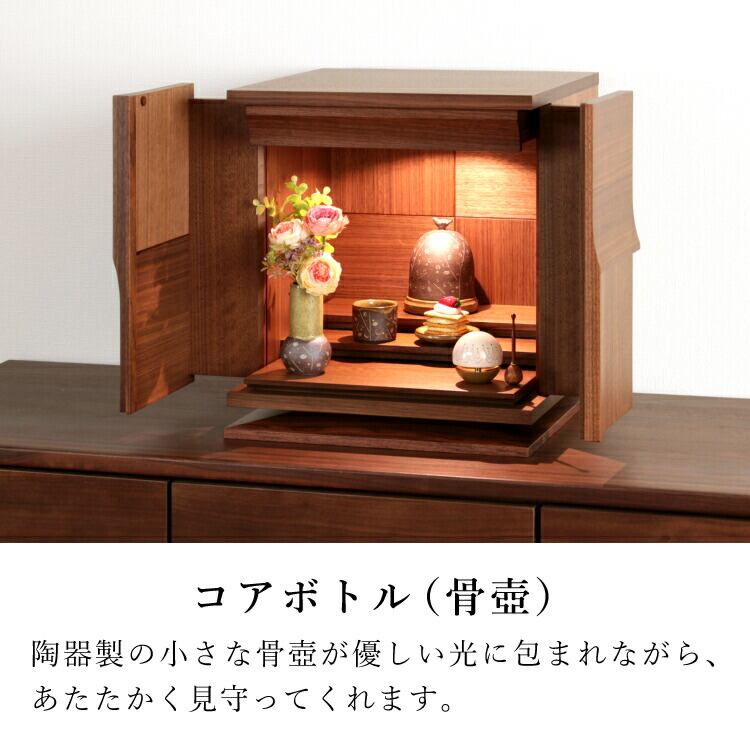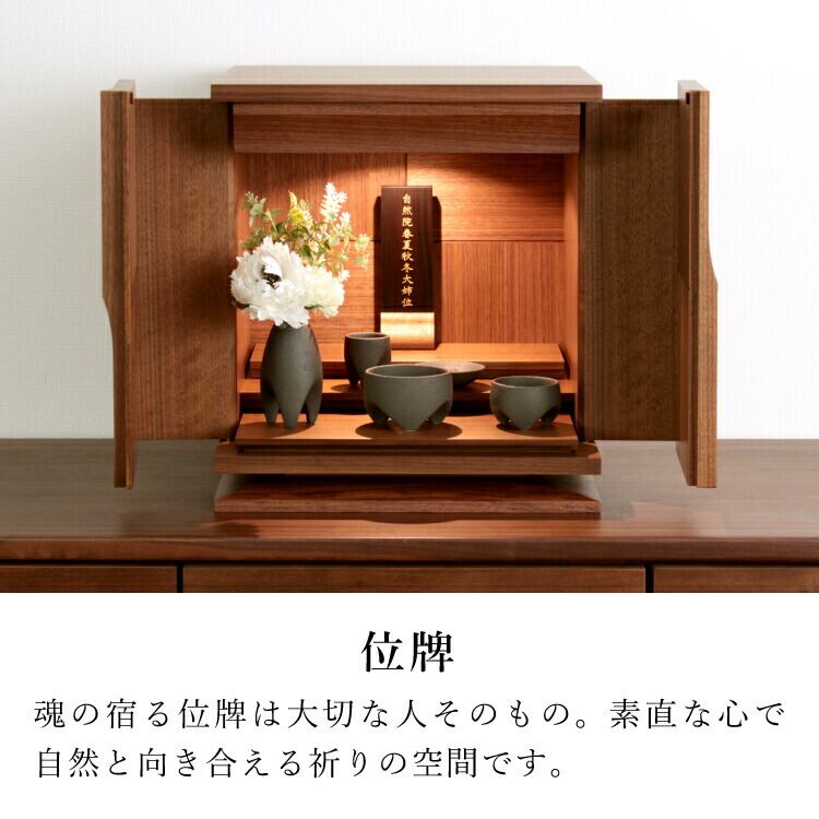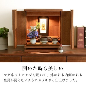 おしゃれなモダン仏壇です。リビングやマンションに合うミニ仏壇。小さいながら開けると開放的な空間が広がり、仏具をのせて動かせるスライド式須弥壇が便利です。