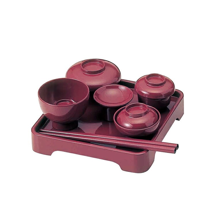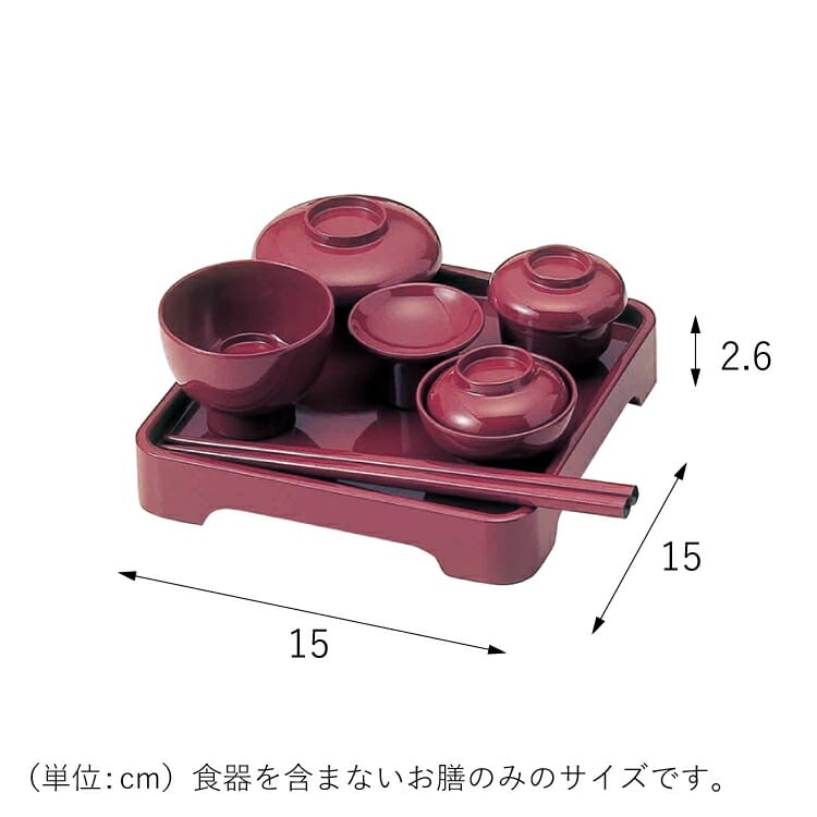 高さを抑えたモダンな霊供膳です。お盆や新盆、初盆、お彼岸、法事など年忌法要の際に、精進料理をお供えする仏膳です。お膳と4つの椀と高坏、お箸のセットです。