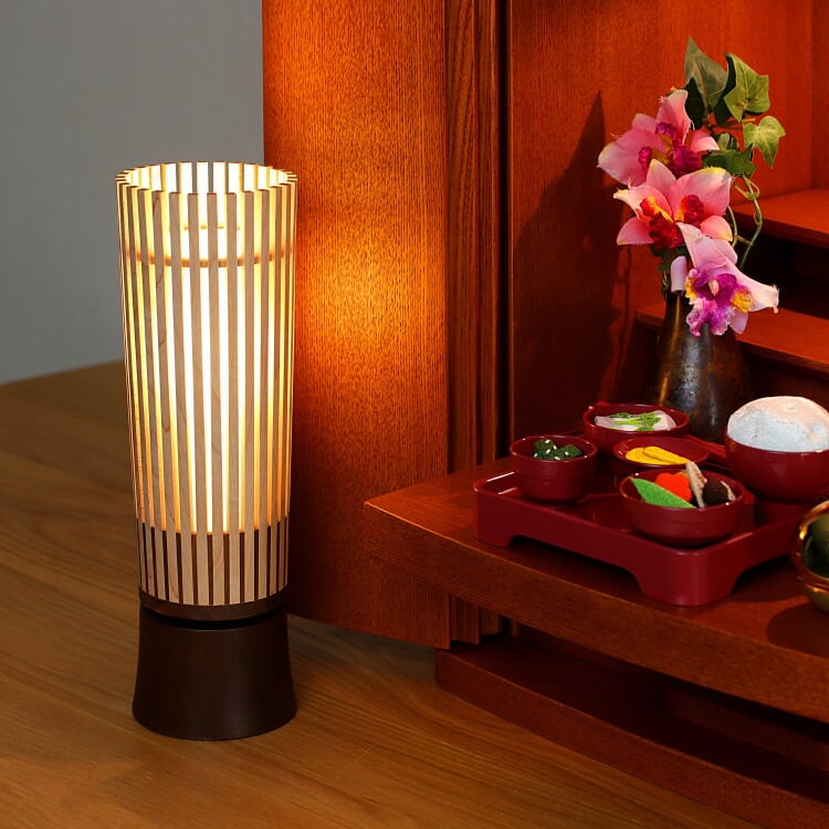 縦桟がおしゃれでモダンな盆提灯です。飛騨高山の職人による日本製提灯として、お盆の贈り物やギフトに最適。色が変えられるので初盆や新盆の後もご使用可能です。