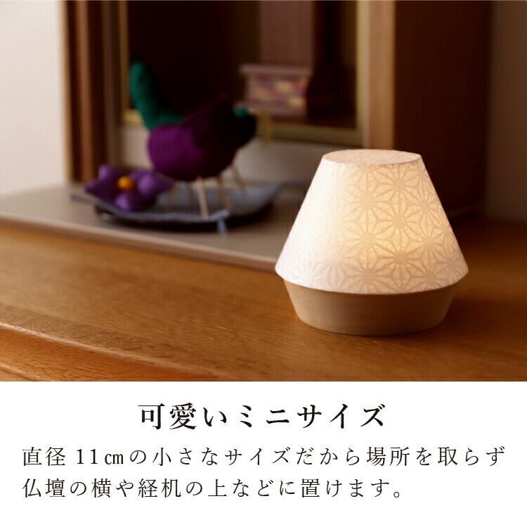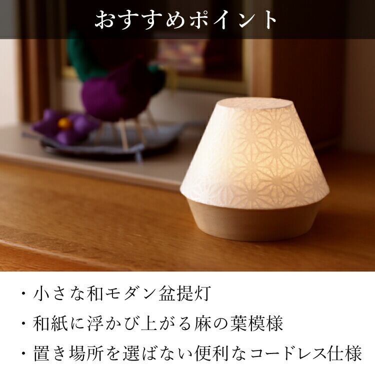 ミニサイズのコードレスLED盆提灯。日本製の小さい灯りに浮かび上がる麻の葉模様がモダンなお盆を演出します。おしゃれでコンパクトだからギフトにもおすすめ。