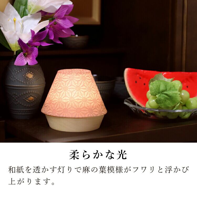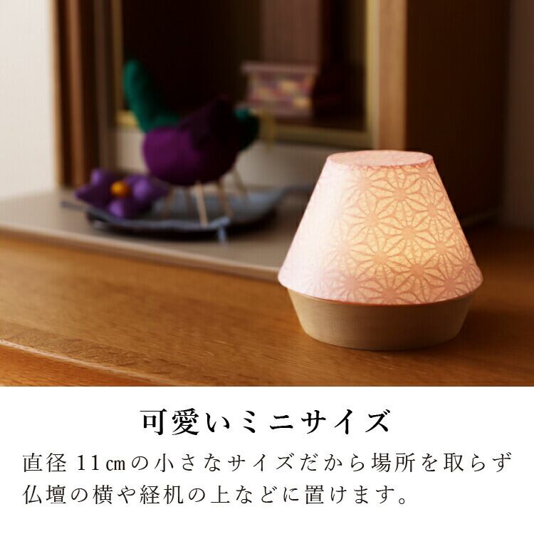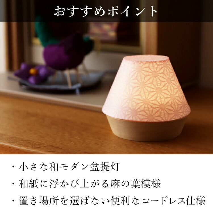 ミニサイズのコードレスLED盆提灯。日本製の小さい灯りに浮かび上がる麻の葉模様がモダンなお盆を演出します。おしゃれでコンパクトだからギフトにもおすすめ。