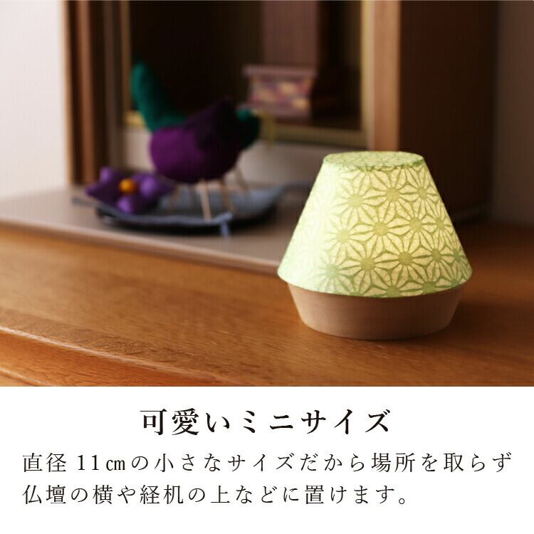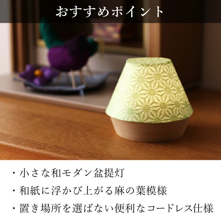 ミニサイズのコードレスLED盆提灯。日本製の小さい灯りに浮かび上がる麻の葉模様がモダンなお盆を演出します。おしゃれでコンパクトだからギフトにもおすすめ。