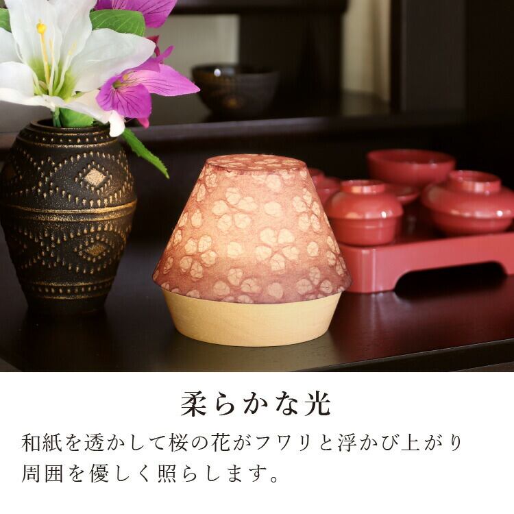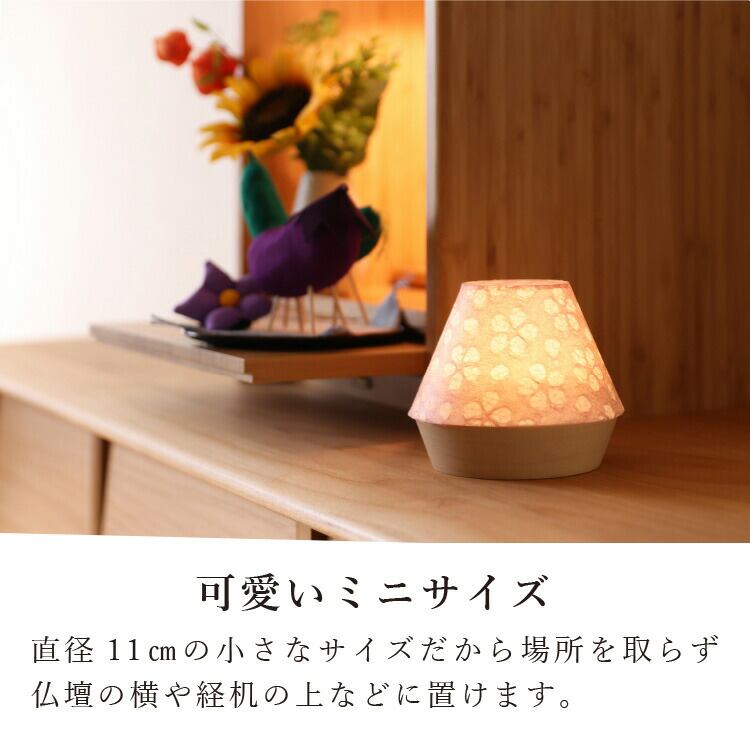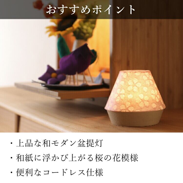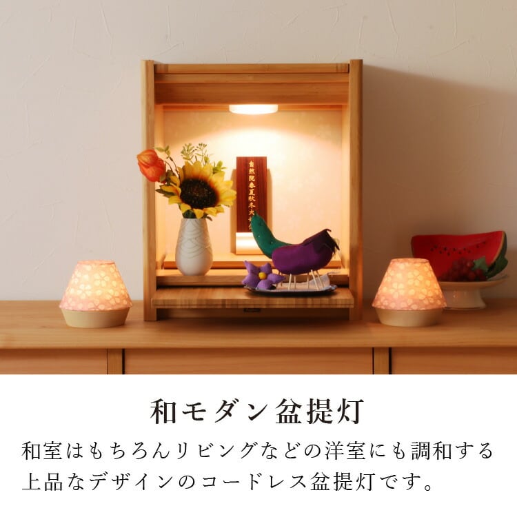 ミニサイズのコードレスLED盆提灯。日本製の小さい灯りに浮かび上がる桜模様がモダンなお盆を演出します。おしゃれでコンパクトだからギフトにもおすすめ。