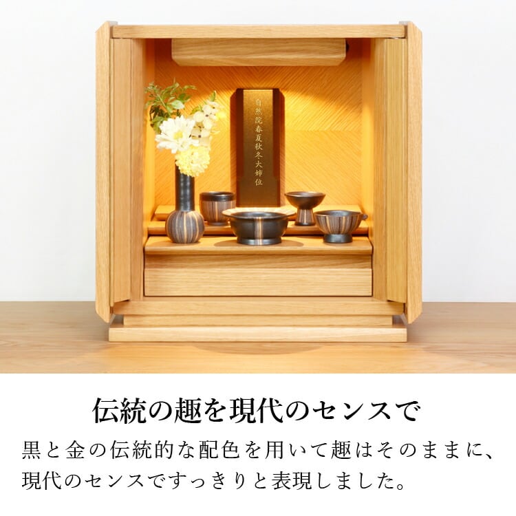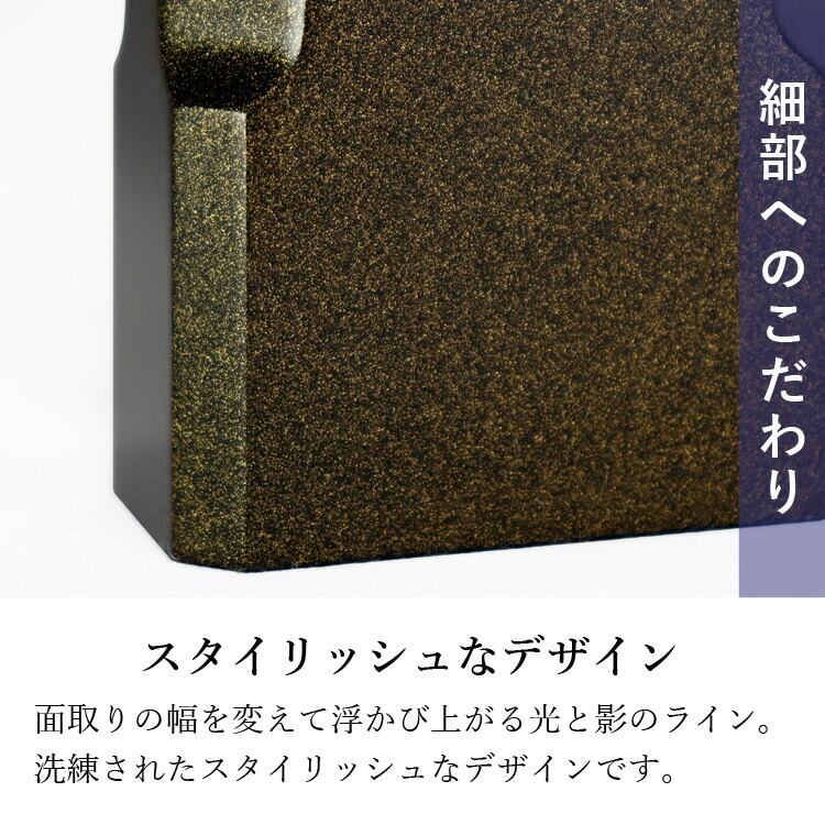 シンプルモダン位牌です。光の角度により金色に輝きます。コンパクトだから小さい仏壇に合わせやすく、夫婦位牌の名入れもできるので手元供養にも最適です。