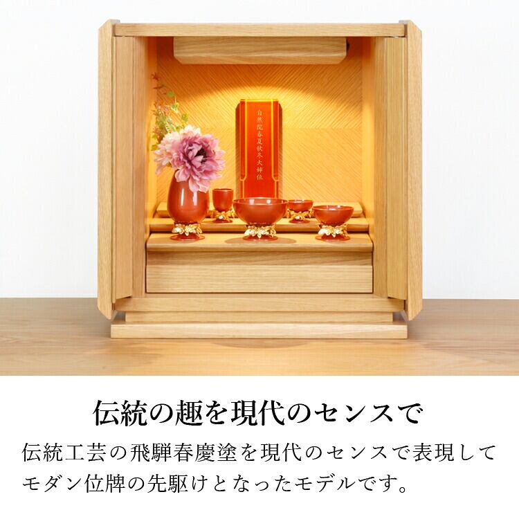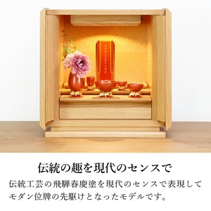 春慶塗のモダン位牌です。おしゃれな琥珀色は時間とともに冴えてきます。コンパクトで夫婦位牌の名入れもできるので小さい仏壇や手元供養にもおすすめです。