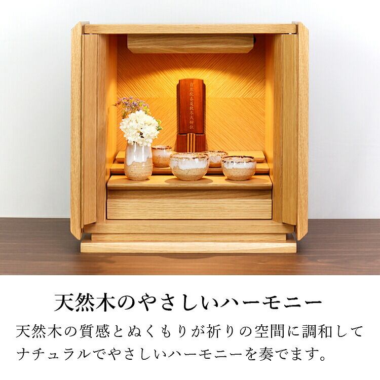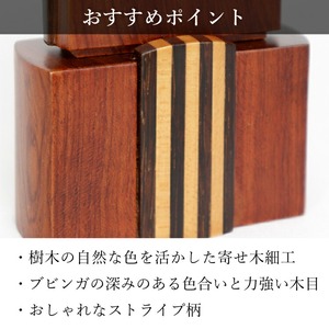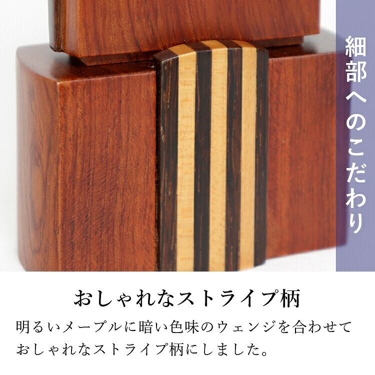 おしゃれな寄せ木のモダン位牌です。自然の色合いを活かしてデザインしました。コンパクトで夫婦位牌の名入れもできるので小さい仏壇や手元供養にもおすすめです。