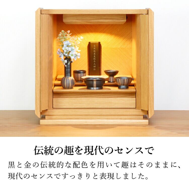 シンプルモダン位牌です。光の角度により金色に輝きます。コンパクトだから小さい仏壇に合わせやすく、夫婦位牌の名入れもできるので手元供養にも最適です。