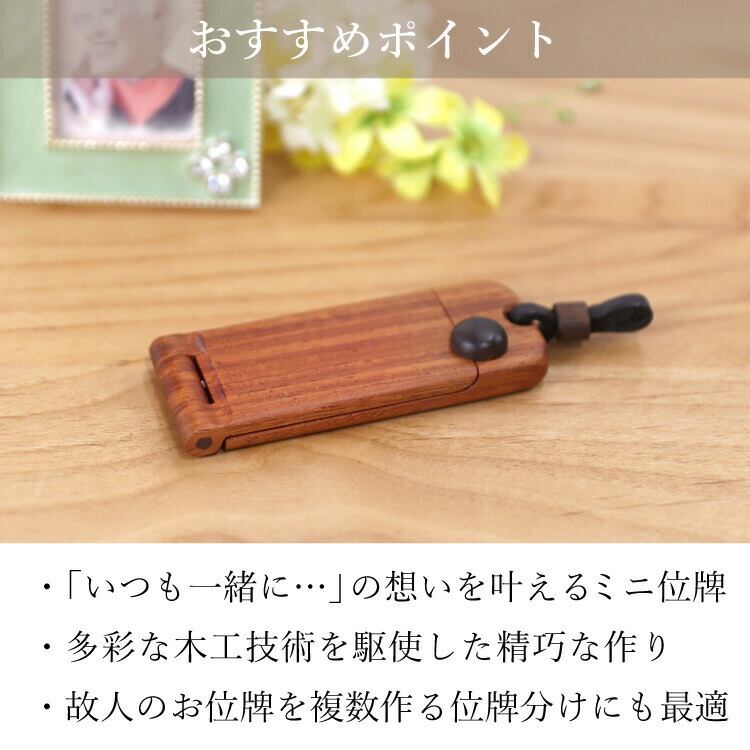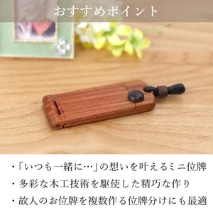 おしゃれでかわいいミニ位牌。小さいパーツまで木のぬくもりが感じられる旭川クラフトです。コンパクトな手元供養にしたり携帯位牌として持ち運びしたりできます。